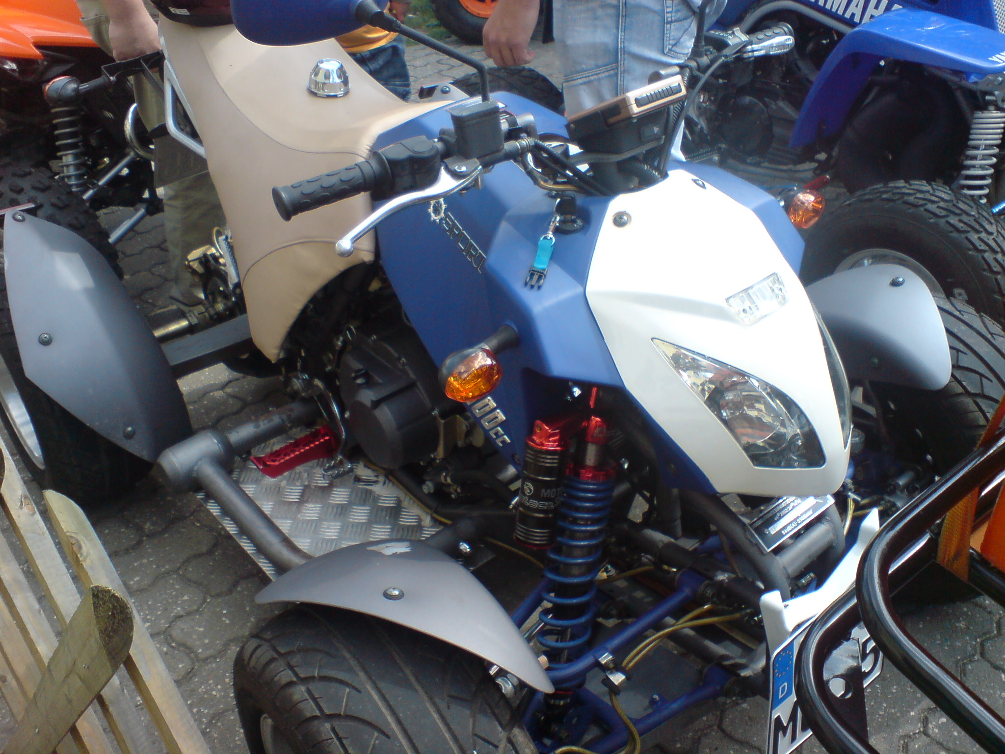 bisherige geschehen ist: totalzerlegung, lackieren des rahmens und der anbauteile in rot-metallic, neulagern und verkleiden der schwinge, änderung der übersetzung, optimierung des fahrwerks, optimierung (einstellbarkeit) der vorderen radaufhängung, neuer frontbumper mit edelstahl adapter, unterfahrschutz in edelstahl gefertigt, umbau auf superbikelenker, griffe schwingungsdämpfer neu, ändern der lenksäule für neue lenkeraufnahmen, umbau der rückwärtsgangarretierung auf kupplungsgriff (entlackt und poliert), spurverbreiterung auf der hinterachse, kabelbaum anders verlegt, krümmer optimiert (drossel entfernt), sitzbank neu in kunstleder bezogen, soziusfussrasten vom neuen model umgearbeitet auf die alten halterungen.