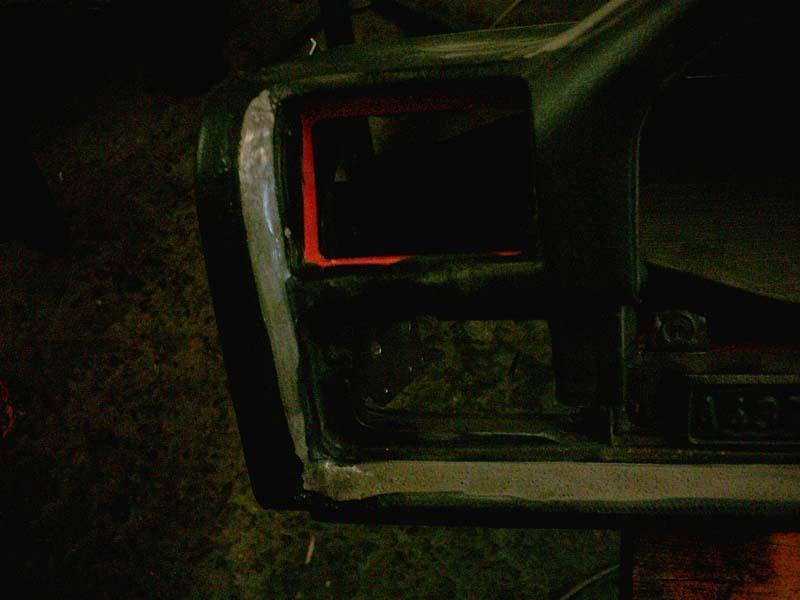 einige kanten sind schon grob beseitigt und durch rundungen ersetzt, der bereich der mittelkonsole wird umgebaut, heizungsschalter bleiben, jedoch habe ich den rahmen für radio und schalter abgetrennt, da dies alles anders werden soll. die uhr ist weg! die radioblende hab ich nur mal zur ungefähren anschauung reingestellt, wird aber noch ganz anders angeordnet. das tid ab ich mal grob reingeklemmt um mir ein bild zu machen. die griffschale oben beifahrerseitig ist verschlossen und mit acryl abgedichtet.