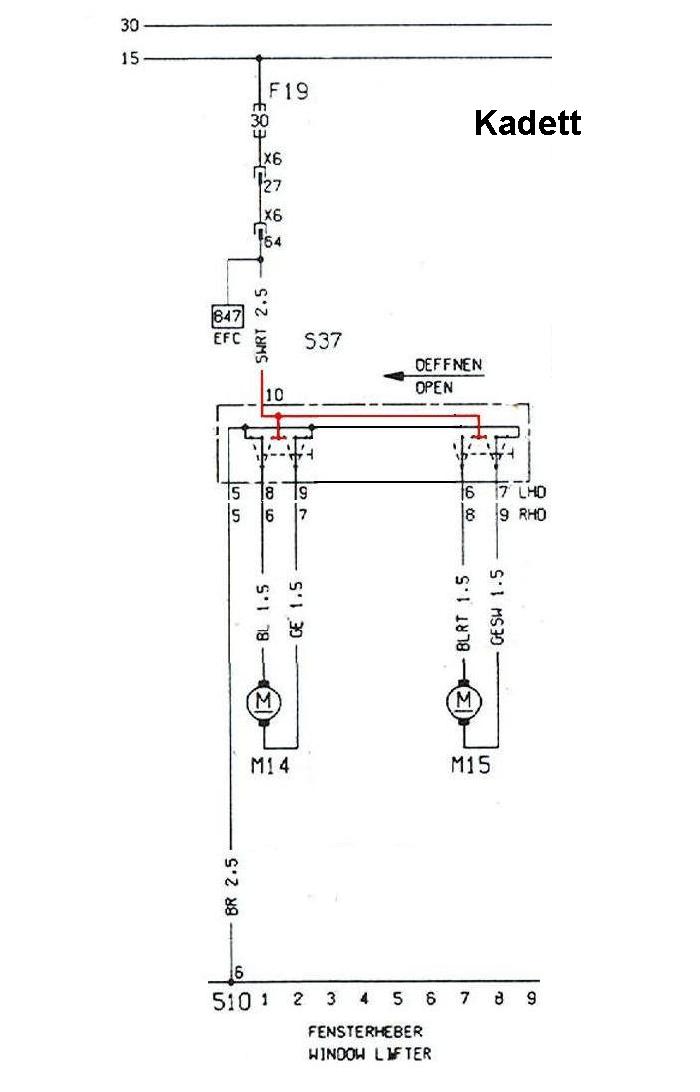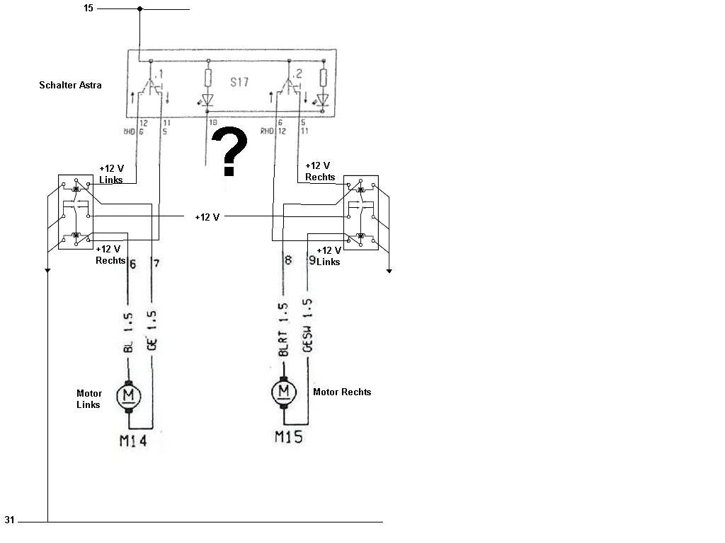 Ich hab vor meine Fensterheber über die Schalter vom Astra G zu betreiben... In der Fahrertür der grosse Schalter mit 2 knöpfen und in der Beifahrertür der einzelne Schalter... Jedoch ist das Problem das die Fensterheber vom Kadett über Masse geschaltet sind... Die vom Astra jedoch nicht... Ich hab hier mal den Schaltplan vom Kadett bis aufs wichtigste reduziert und den Schaltplan vom Astra G schonmal soweit mit eingefügt... Kann mir vielleicht jemand sagen wie ich den Schalter anschleissen muss damit ich die Fensterheber ordentlich betreiben kann???