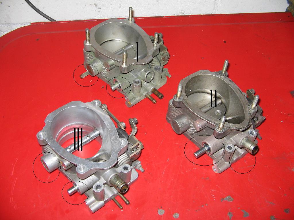 Die Drosselklappen sind mit I, II, III gekennzeichnet und die Unterschiede sind durch den Kreis markiert.