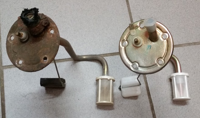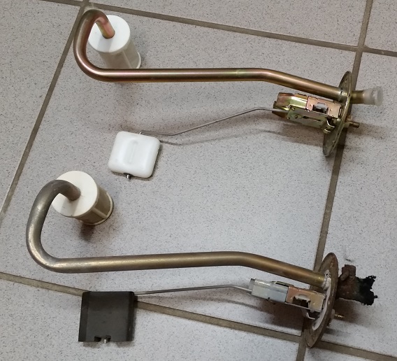 Beim Aufräumen hab ich doch tatsächlich noch einen Tankgeber gefunden. Müsste normalerweise vom GT/E sein. Hab ihn dann mit meinem neuen verglichen und festgestellt, dass der Schwimmerkörper anders ist, anders befestigt ist und sich nicht am Draht dreht. Beide Geber sind von VDO.