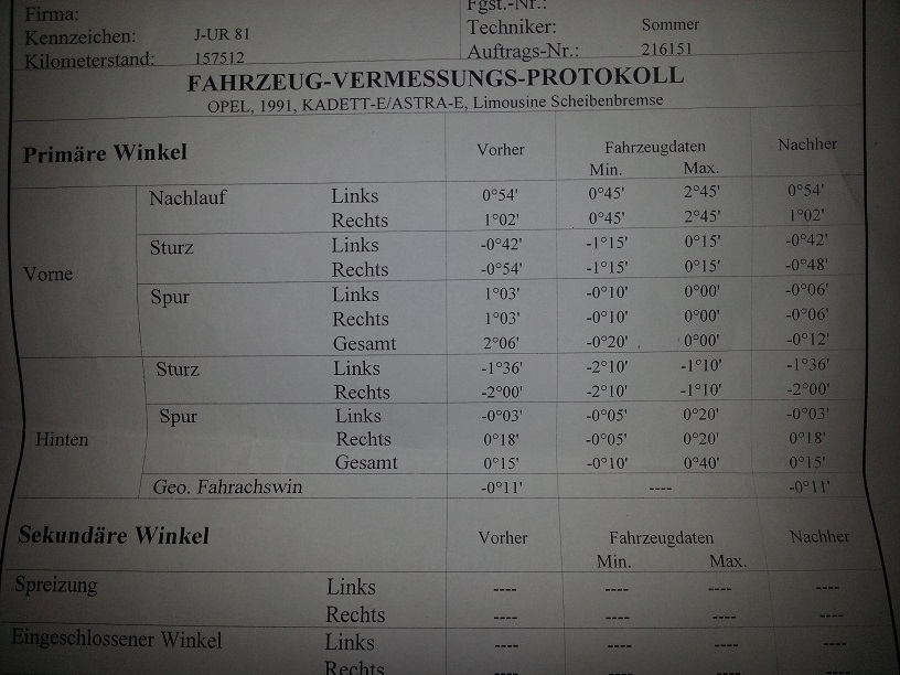 Als ich das angesprochen habe meinte man nur trocken, das man am Sturz beim Kadett sowieso nix ändern könne...Mit dieser Fachmännischen Auskunft will ich mich natürlich nicht abfinden...es ist ein total blödes gefahre jedesmal.