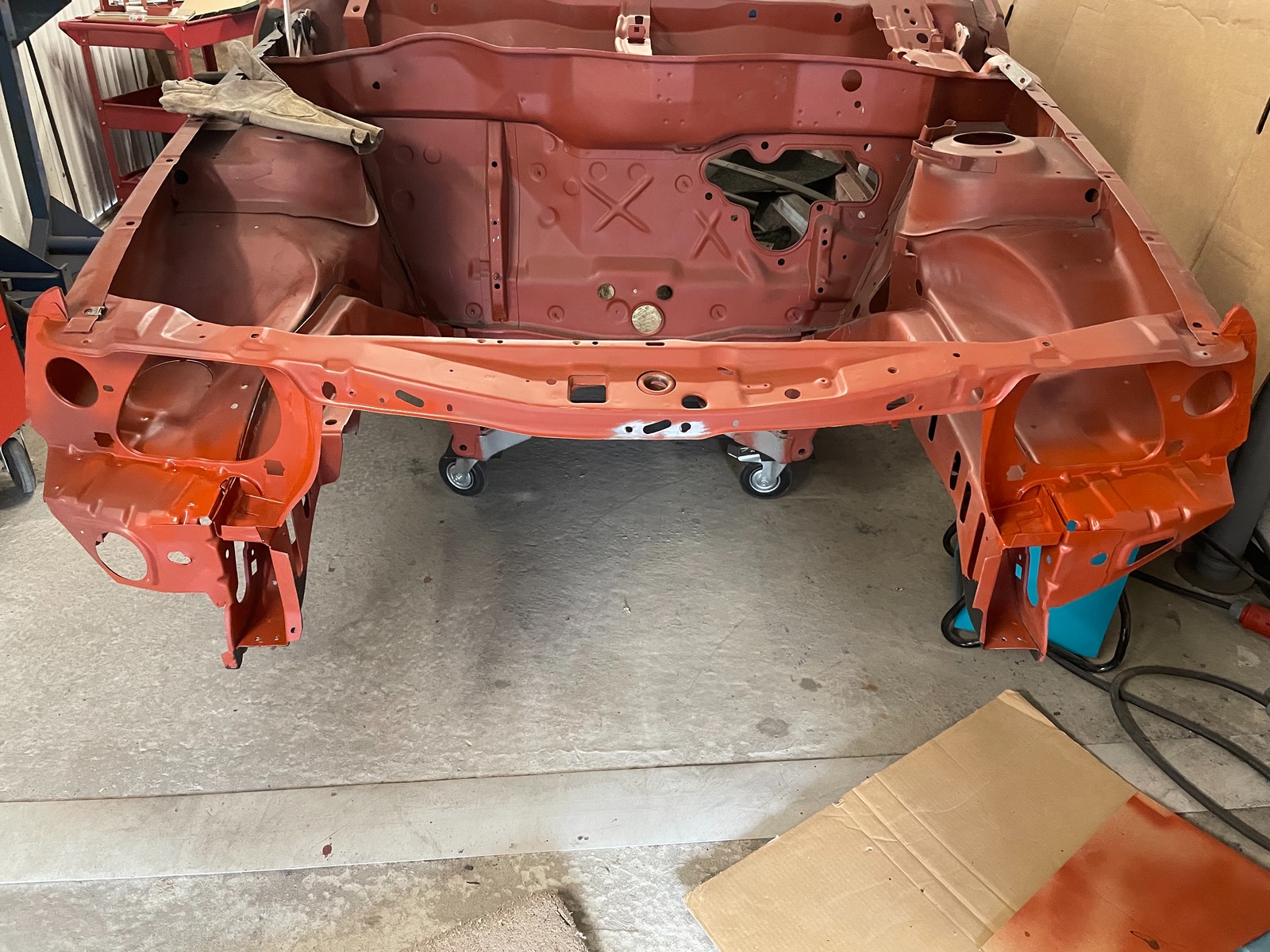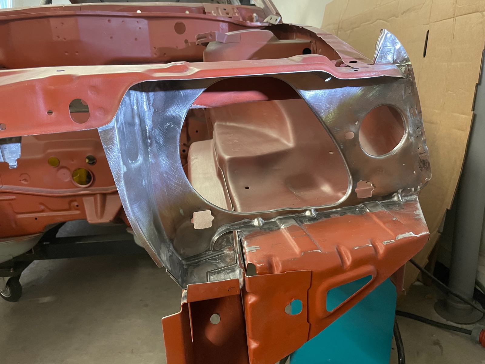 Mit dem Cleanen bin ich weiter gekommen. Nun ist auch der Halter der Motorhaube Geschichte. Damit es optisch gleich aussieht habe ich aus einem Reststück eines Schlossträgers ein passendes Stück ausgeschnitten und angepasst, damit ich die Rundung möglichst genau hin kriege.