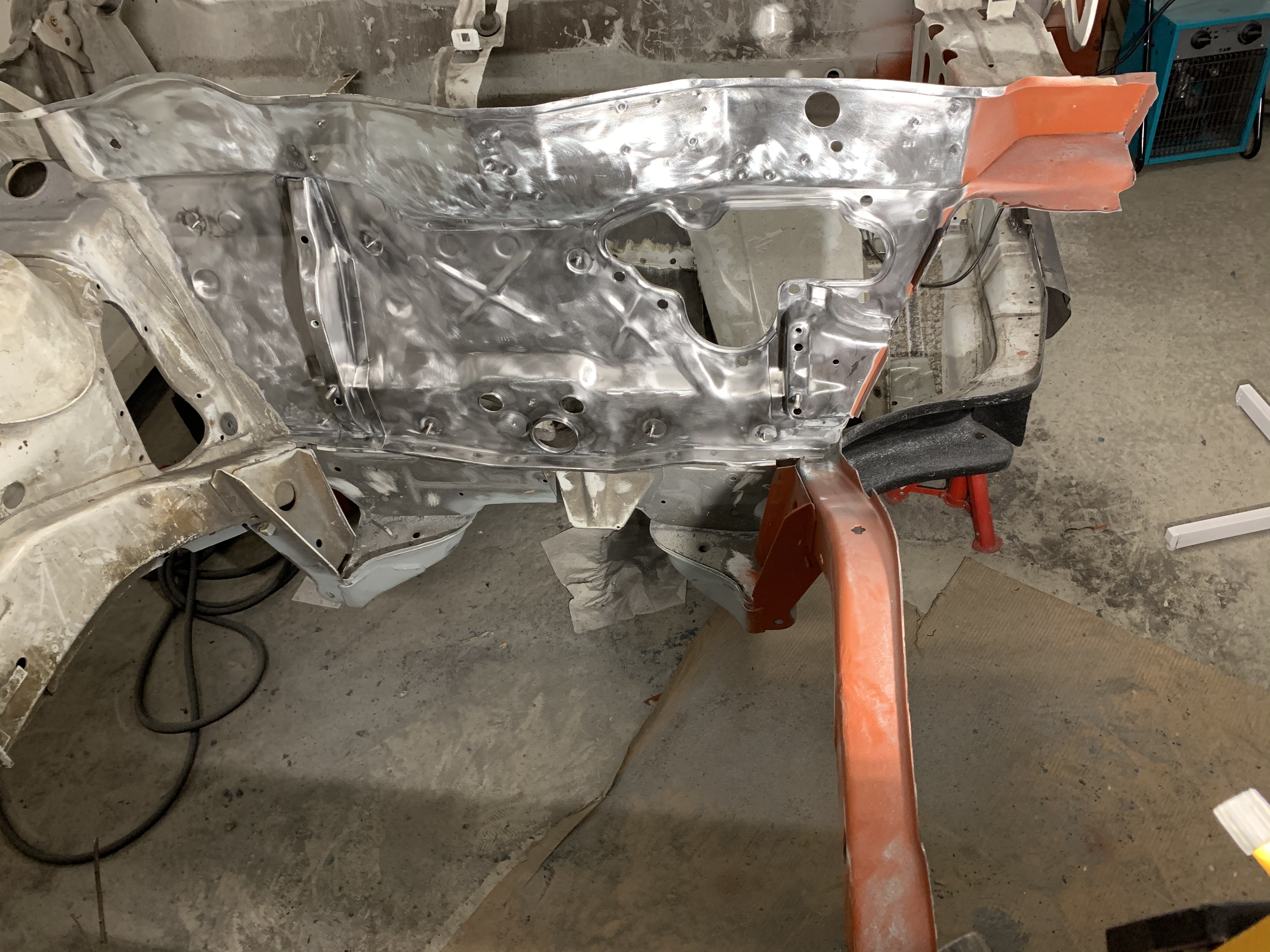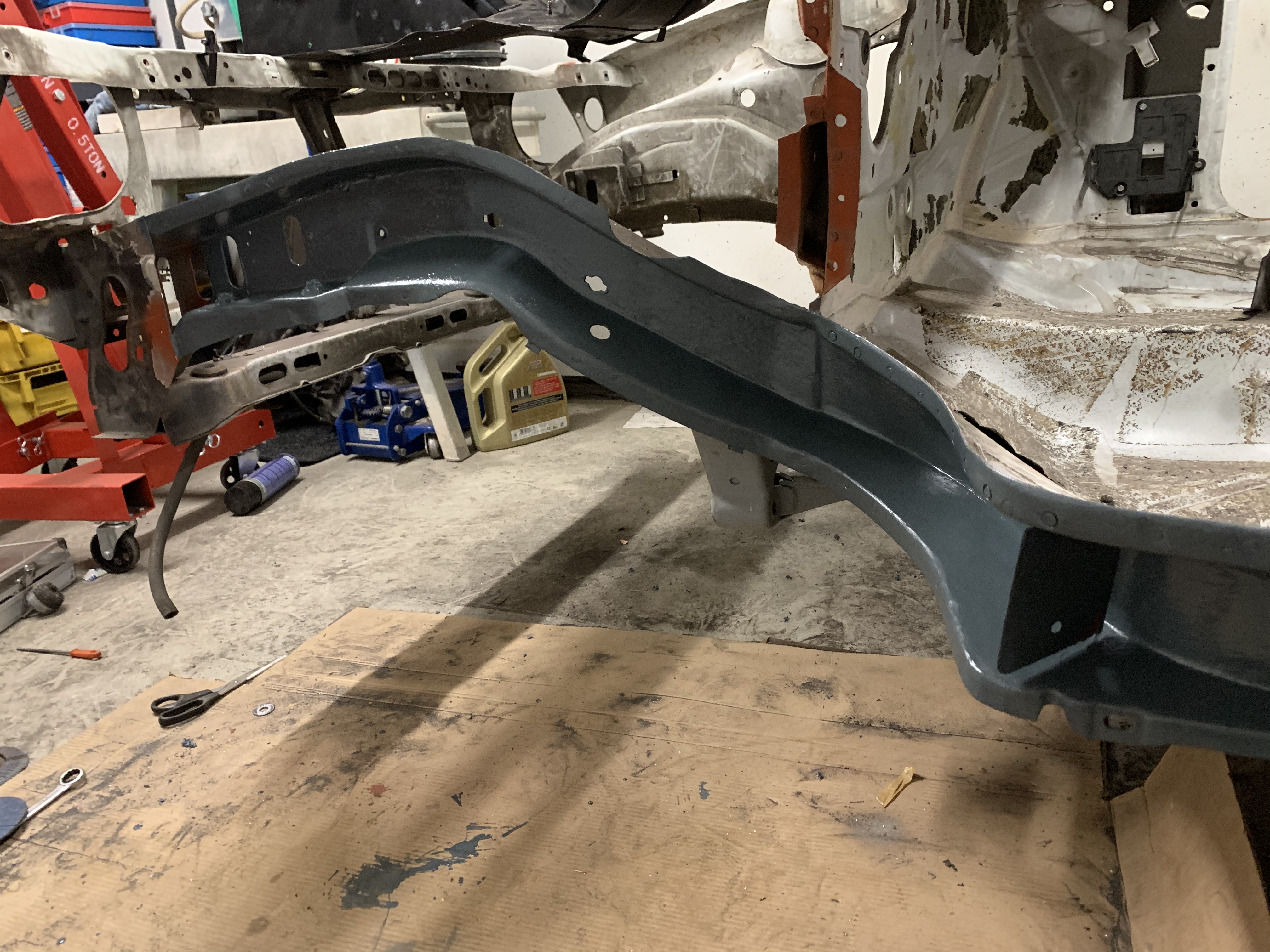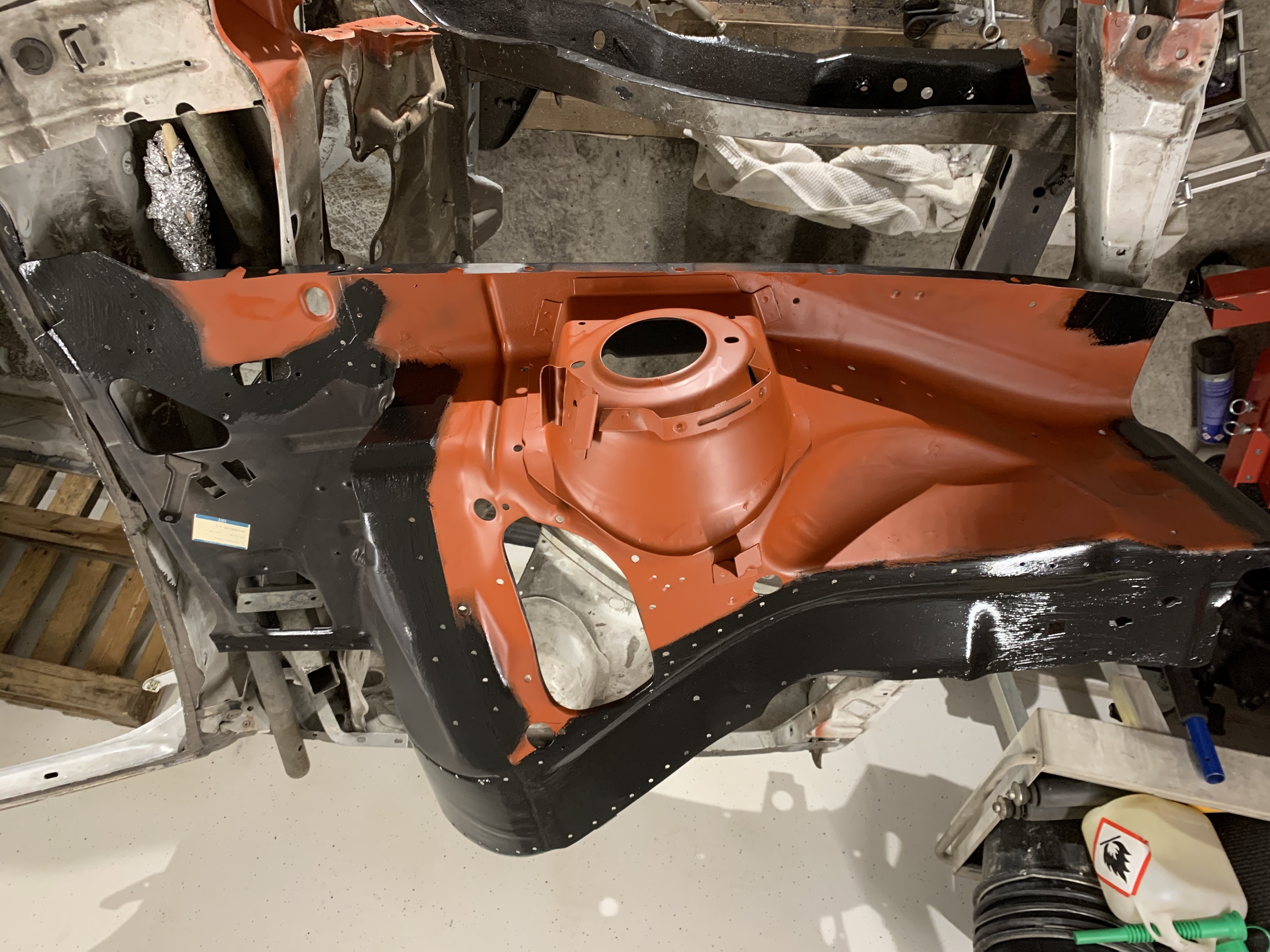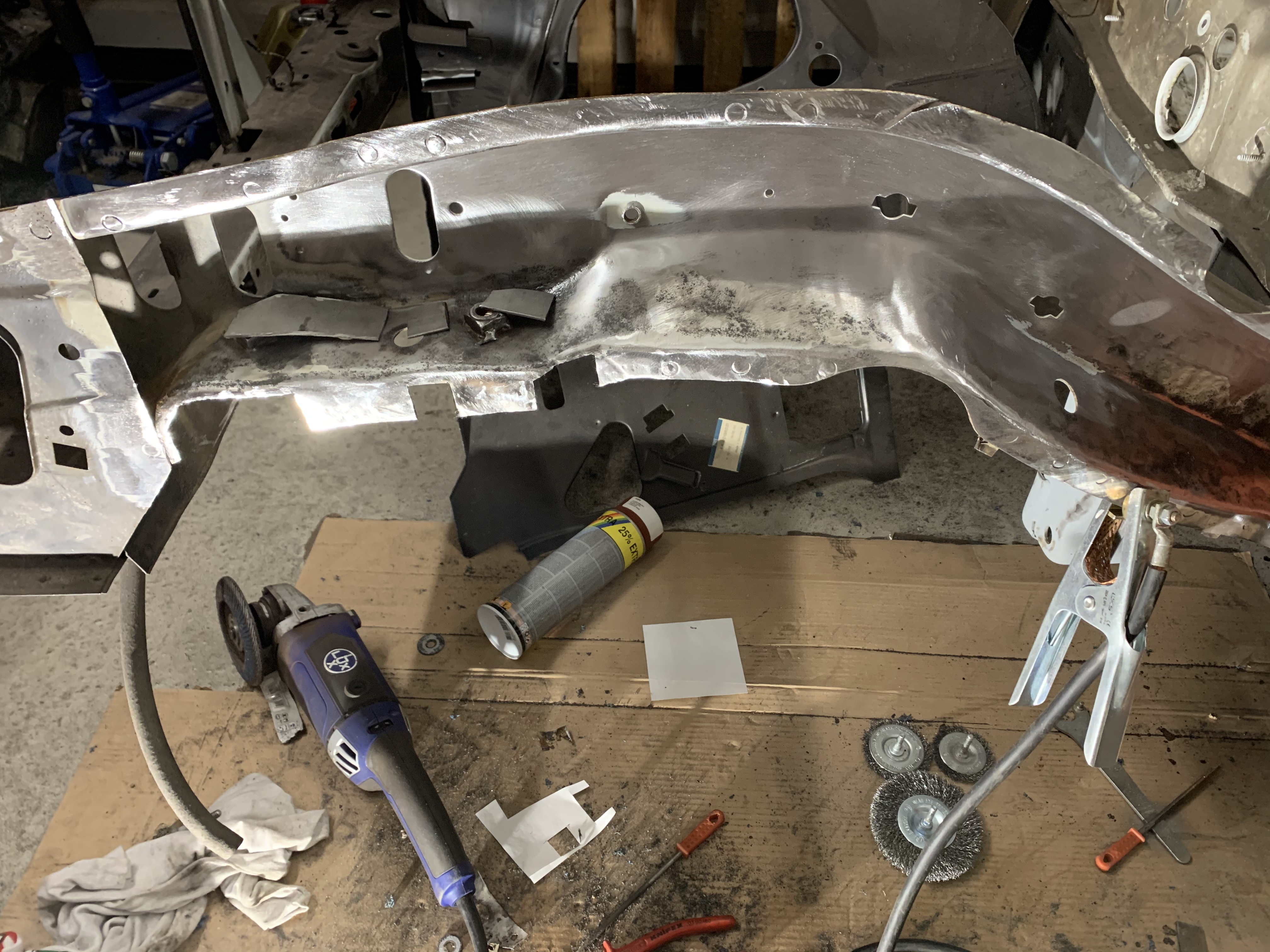 Also die Arbeiten, die ich mit die letzten Tage/Wochen gemacht habe sind sehr mühsam. Sind bestimmt 10.12 Stunden Arbeit rein geflossen, da ich alles sehr sorgsam mache. Ich habe den Längsträger von der Innenseite sowie den grössten Teil der Spritzwand vom Lack und Deck und Rost befreit und schonmal grundiert. Den Radeinbau habe ich soweit auch schon vorbereitet. Die Stellen, die nachher im Längsträger sind und wo ich später nicht mehr dran komme habe ich erst mit Brantho Nitrofest und dann mit 2 Schichten Brantho 3 in 1 bestrichen...damit da später nix mehr rostet ![]()