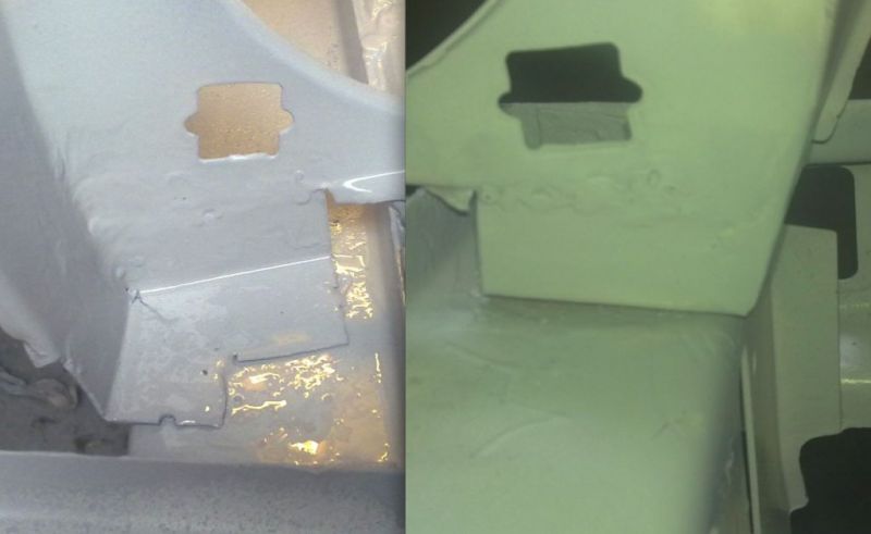 Hab überall dahin Farbe/Schweißgrund aufgebracht, wo blankes Blech war. Dient eigentlich nur gegen Flugrost der in den nächsten Tagen entstehen könnte. Das Epoxy wollte ich erst anwenden wenn alles fertig geschweißt ist. Das Lackierpistolen reinigen hinderte mich daran jetzt schon zu epoxieren