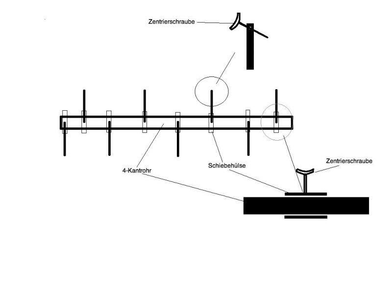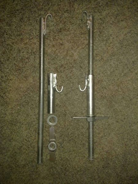 Besteht aus 2 Stück M20 Gewindestangen zu a 50cm, einem alten Wasserleitungsrohr (2 x 15cm), welches genau über den Gewindestab rutschen kann (3/4") und 4 x 6mm gebogenem Flachstahl das an das eine Ende des M20 Gewindestab geschweißt wird. Das Andere an das zugeschnittene Rohr. Funktioniert gut und verrutschen, während des Spannens tut es auch nicht. Später wenn die Farbe trocken ist, werde ich noch Gummis in den gebogenen Flachstahl einsetzen, damit ein Verrutschen ausgeschlossen ist...