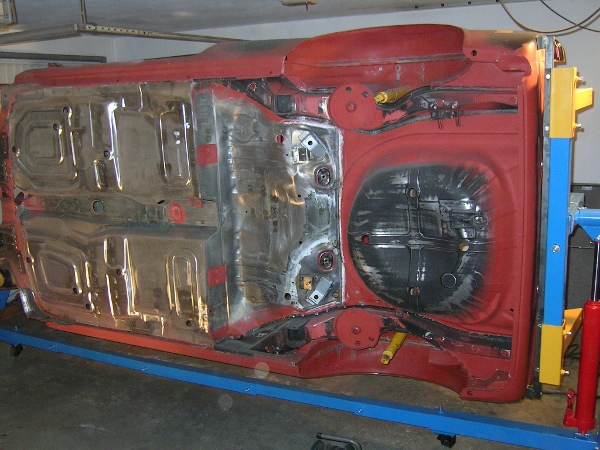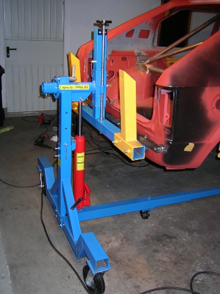 Das Drehgestell hab ich vor 2 -3 Jahren mal bei Ebay gekauft. Ist halt so ein China-Ding, wo man noch etwas nacharbeiten muß. Ein Hubzylinder war von Anfang an hin (verstopft) - kriegt man auch bei Ebay. Die gelben Teile gehören eigentlich waagrecht angebaut und die Karosserie dann drauf befestigt - dann wäre das ganze Gestell zu lang für meine Garage geworden - deswegen hab ich andere Befestigungen noch auf die gelben Teile geschweißt. Die Drehachse wird mit Spindeln eingestellt - so daß man ohne viel Kraft das "Hähnchen" rumdrehen kann. Die Hydraulikzylinder sind zum Heben und Senken - geht alleine etwas mühsam. Es besteht aus zwei solchen Gestellen, die unten noch mit Vierkantrohren etwas zusammengehalten werden.