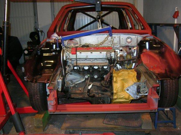 Ascona C 2.0 i Motorhalter vorne rechts, E - Kadett Bigblockhalter (die symetrische Variante) mit Schaltumlenkung hinten mitte und Eigenbauhalter fürs F28 vorne links (erst Testmodell). Das Ganze möchte ich noch ca. 1 cm nach hinten setzen - am linken Getriebehalter der Karosserie und F28 ist kaum Platz.