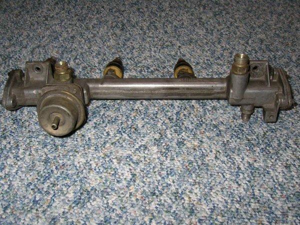 Nicht daß wir uns falsch verstehen, nicht die ganze Ansaugbrücke, sondern nur das Verteilerrohr mit den Einspritzventilen. SFI - Kasten weg, Halter Gaszug weg. Dann sind da rechts und links zwei Masseverschraubungen, die gleichzeitig diese Verteilerleiste mit den Ventilen an der Ansaugbrücke befestigen - die obere Mutter hält das Massekabel und der restliche Bolzen dann die Leiste. Dann sollte sich der ganze Spaß nach oben abziehen lassen - wird zwar eng, da die Benzinleitungen dran sind aber müßte sich soweit rausziehen und hochheben lassen, daß man zu den unteren Teil der Einspritzventile hinsieht. Das Teil hier :