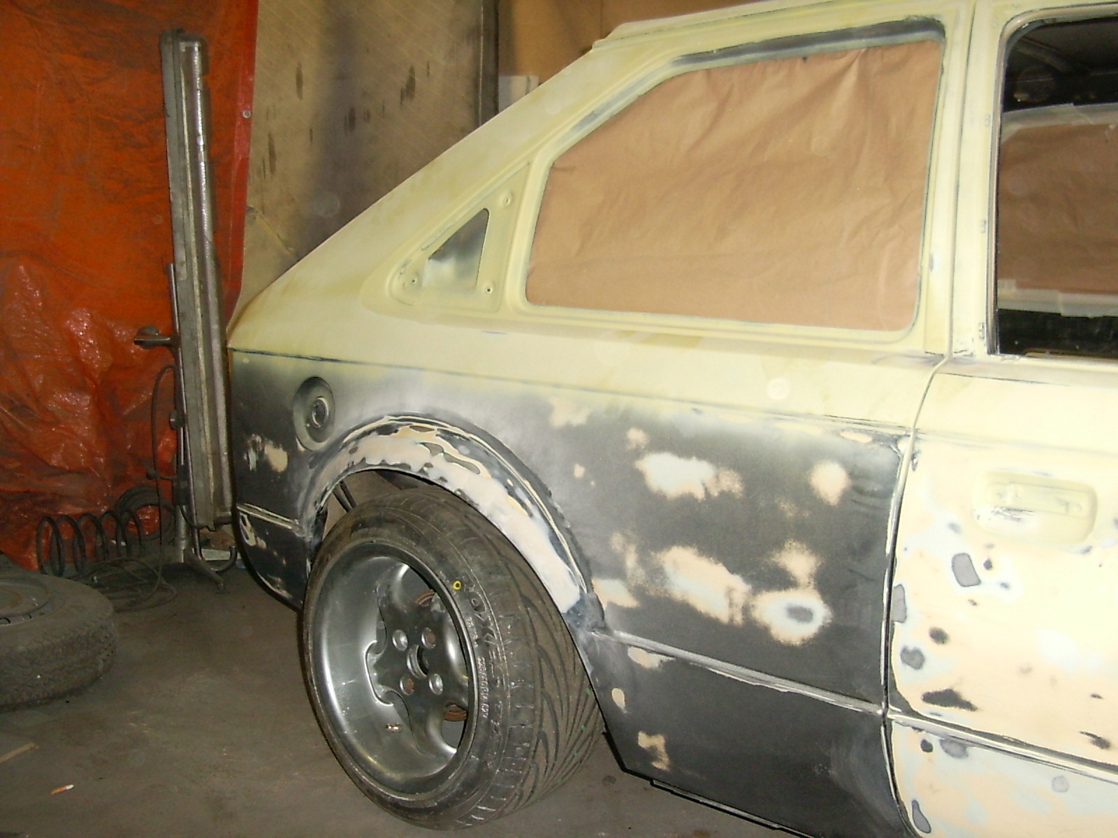 Werd am WE noch mal ein paar Fotos machen,wir haben heut morgen vorne auch noch mal ne Felge draufgebaut und die Radläufe gespachtelt.