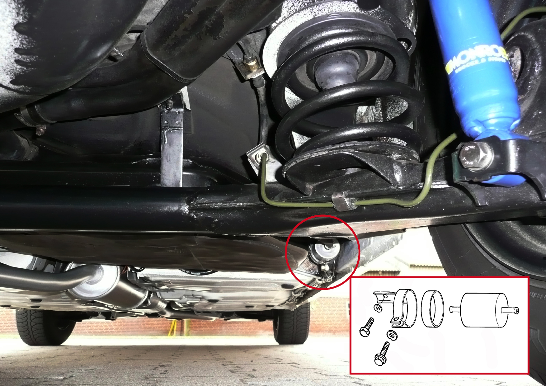 der Benzinfilter wird mit einer speziellen Halteschelle auf der Beifahrerseite am Tank befestigt.
