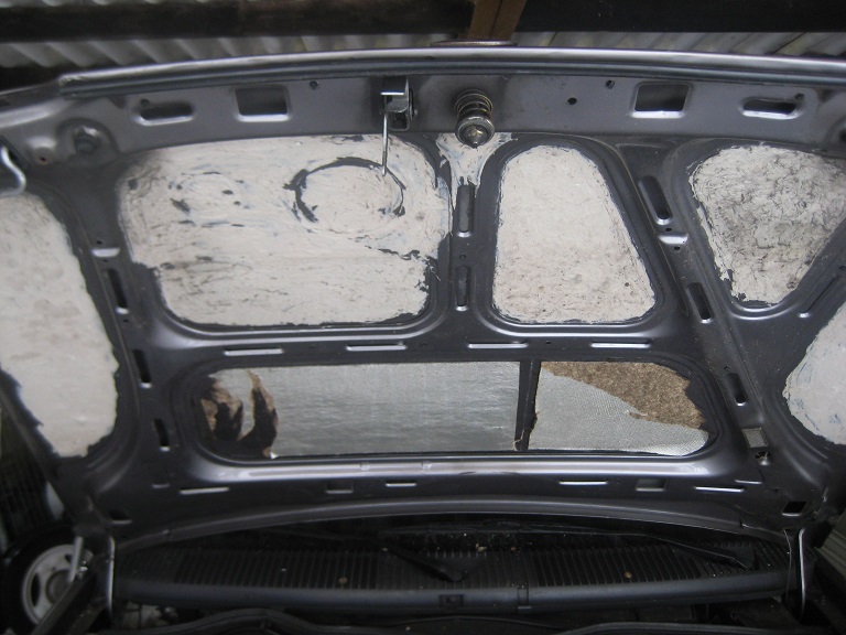 Der gute Mann hat jeden Hohlraum der Motorhaube mit Flies ausgestopft und die Haube noch mit Antidröhnpaste eingeschmiert.So ein Dreck.