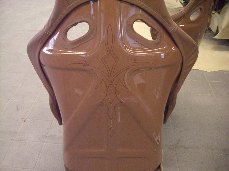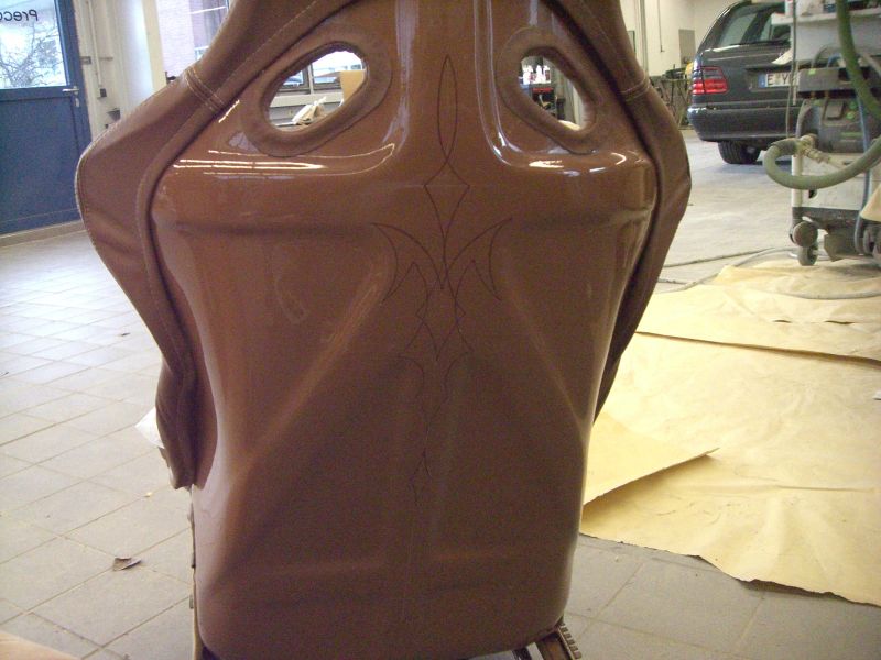 Desweiteren habe ich heute ein Loch ins Blech gebohrt :ahhhh: Habe hinter dem Nummernschild der Heckklappe eine Öffnung durch die man jetzt manuell die Heckklappe öffnen kann. Und der Skalle hat weiter gemalt, die Sitze mussten nun dran glauben, sind aber noch lang nicht fertig -