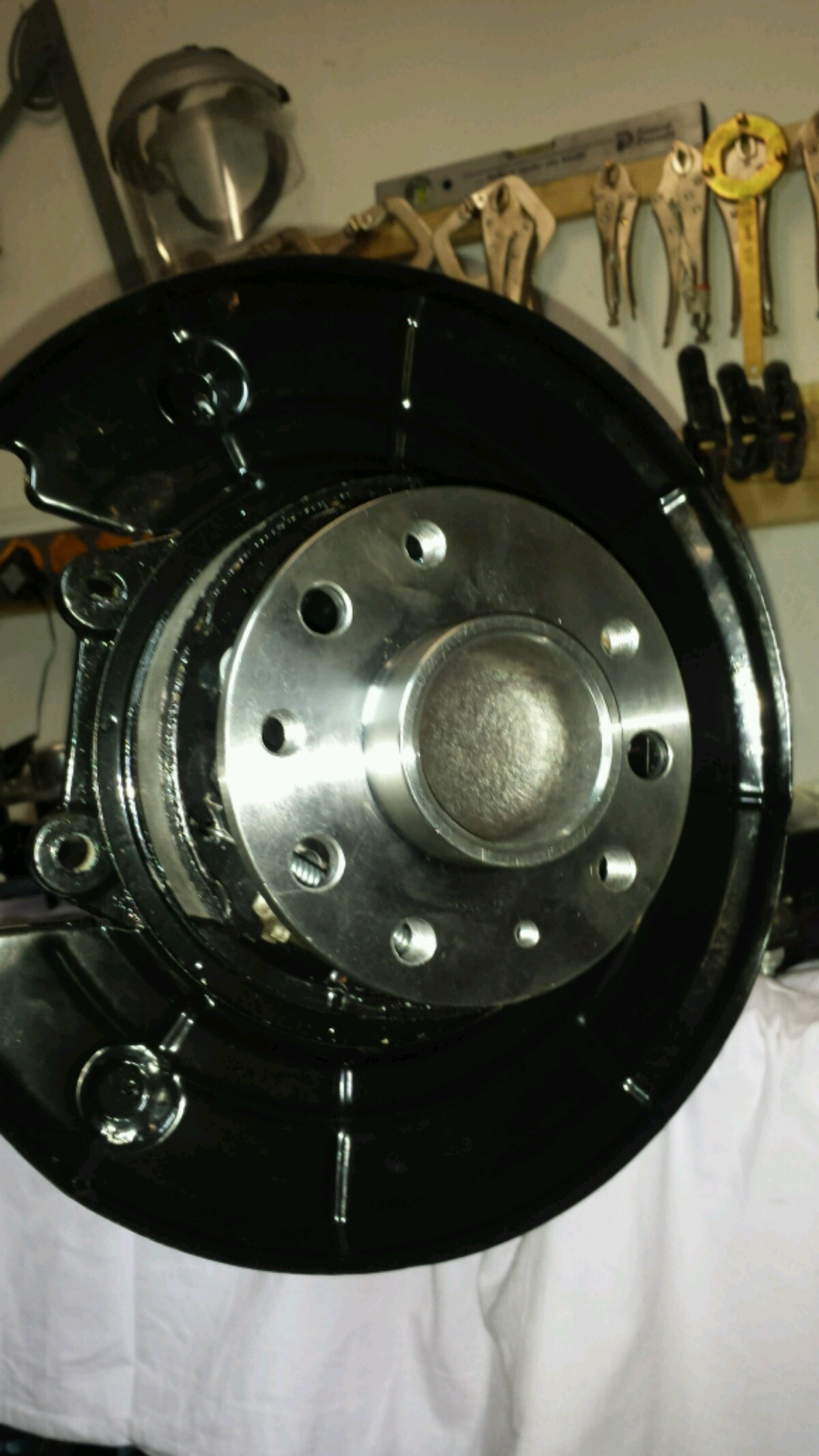 Ja das sind die Ankerplatten für die 286x10 Bremsscheiben. Problem war eben das die Handbremsbetätigung "unten" war. Daraufhin hab ich durch einen Tip von nr1ebw die Seiten vertauscht und mir eine neue Umfangsposition gesucht die womöglich kein Langloch erzeugt. Das 2 Bohrungen passen hätte ich auch nicht gedacht. Zwecks zentrieren hab ich von einer alten Radnabe die 2 Bolzen die nicht passen abgeflext und die Bremsankerplatte montiert. Anschließend von hinten mit einem Zentrierbohrer samt 11er Hülse die beiden Bohrungen zentriert und in der Säulenbohrmaschine auf 11mm aufgebohrt.