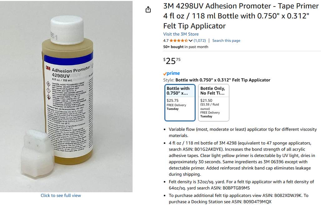 3M Klebeband auf Kunststoff oder Lack braucht Adhesion Promoter (Haftvermittler). Das korrekte Produkt ist 3M 4298UV, wobei das "UV" fuer die Sichtbarkeit der aufgetragenen klaren Fluessigkeit unter UV-Licht sorgt. Sollte es ein 3M 4298 ohne UV geben, das ist mehr oder weniger das gleiche Produkt, eben ohne UV-Sichtbarkeit.