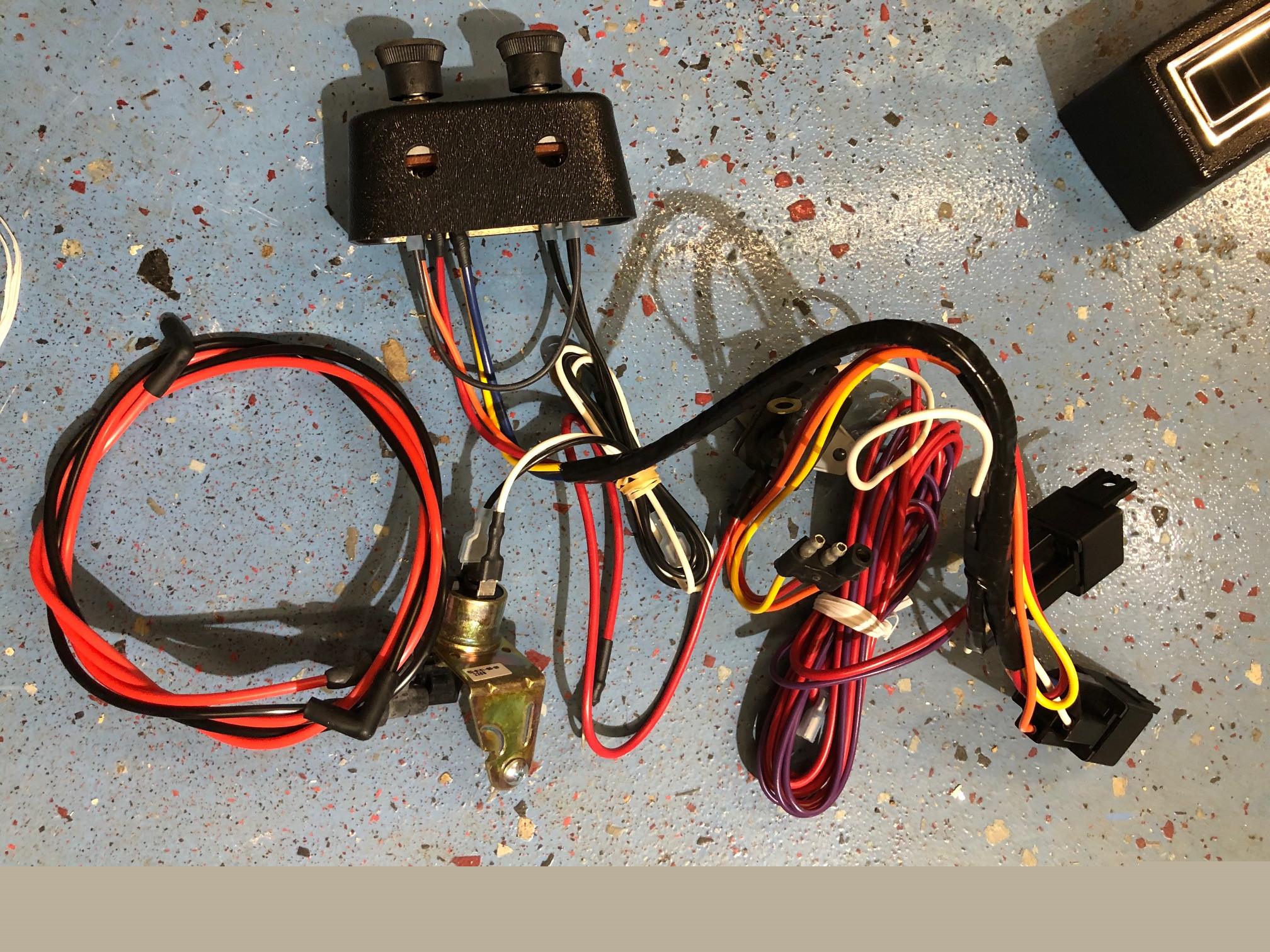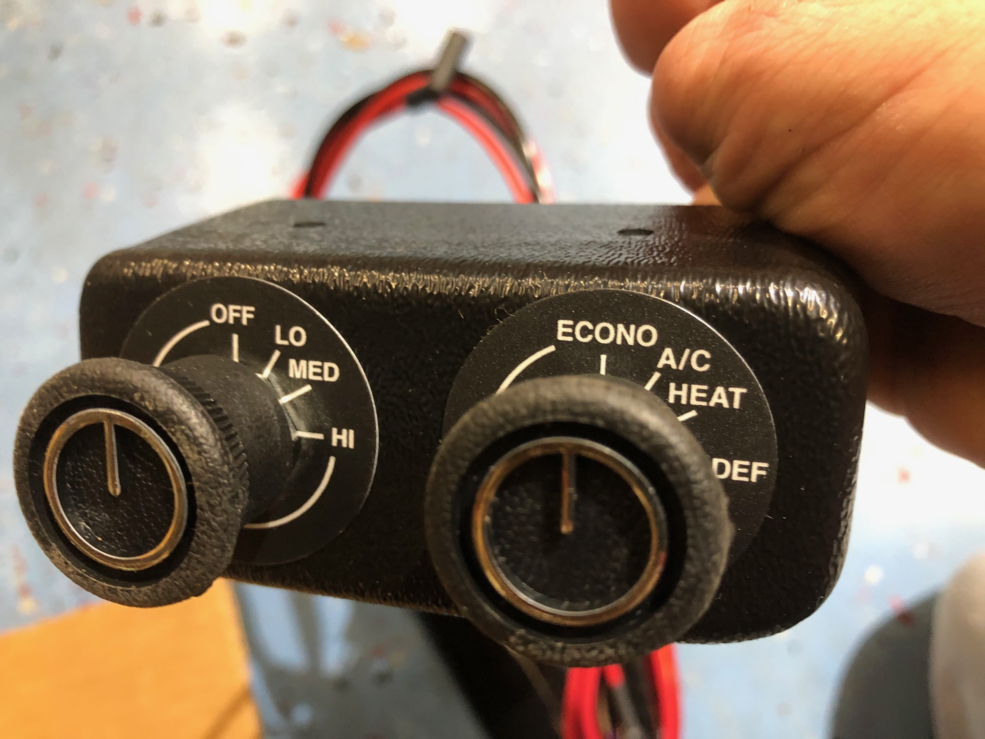 Die Bedienungseinheit hat zwei Knoepfe fuer die Geblaesestufe und die Funktion, ein weiterer Knopf ist der Thermostat der am Gehaeuse angeschraubt zu sehen ist, der aber auch woanders montiert werden kann. Der Funktionsschalter hat auch eine Stufe fuer "Defrost", das schaltet ein Relais am Kabelbaum das eine externe Luftklappe betaetigt, ich werde das bei mir auch benutzen um die Scheiben bei Bedarf freizublasen.
