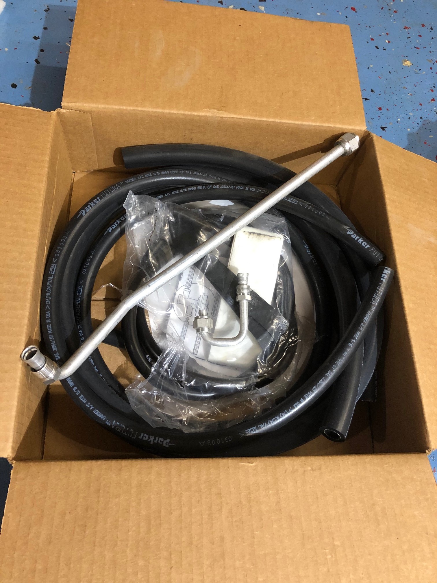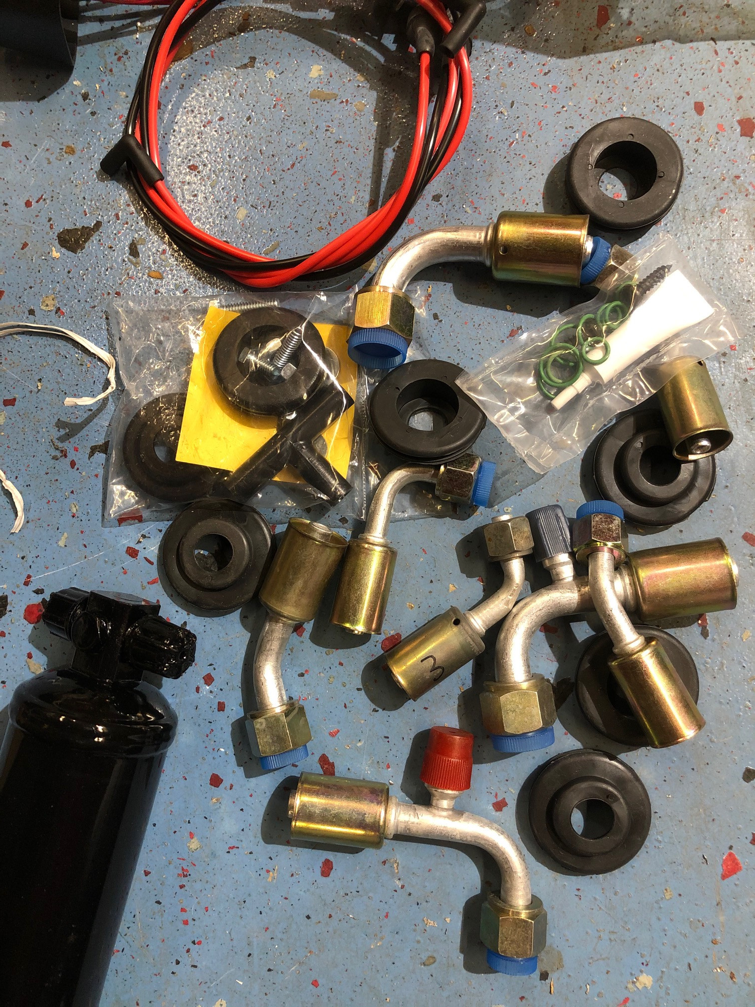Wie in den Bildern zu sehen ist gab es genug Kleinteile und Zubehoer um noch ein drittes System anzuschliessen. Die Klimaschlaeuche muessen logischerweise waehrend des Einbaus im Fahrzeug angepasst werden. Die Stellung (Positionierung) der Anschluesse werden dann mit einem Edding oder Lackstift angezeichnet (Positionierung Schlauch zu Anschluss), damit sie dann rausgenommen und von einer Werkstatt verpresst werden koennen. Das ist wichtig damit die Schlaeuche nachher ohne Vorspannung (Verdrehung) im Fahrzeug sind, da die Anschluesse nach dem Verpressen nicht verdreht werden koennen.