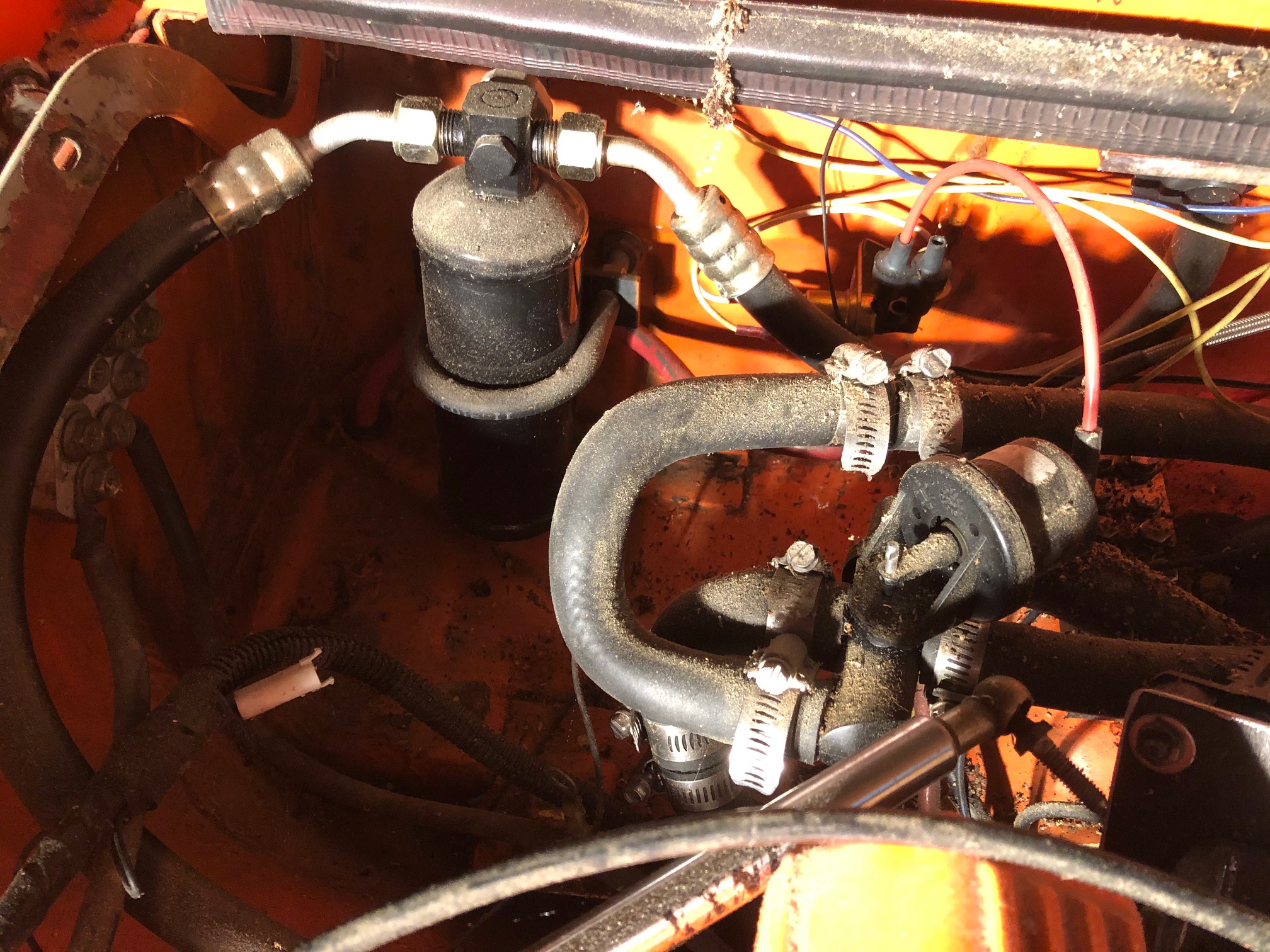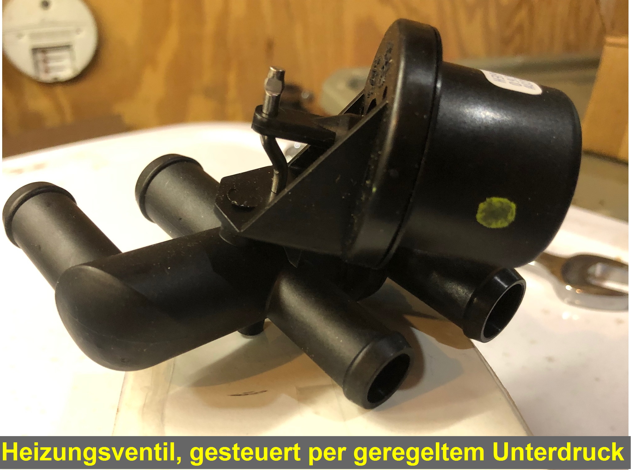 Das Heizungsventil ist per geregeltem Unterdruck gesteuert (vom Motor abgezapft). Die Anlage regelt so die Menge an heissem Wasser die durchstroemt, um die Teperatur entsprechend einzustellen. Ich hatte damals keine Heizungsventile mitgekauft, aber im normalen Zubehoerhandel genau das gefunden was ich gebraucht habe. Die Ventile schliessen die Vor- und Ruecklaufleitung vom Motor zusammen wenn kein Wasser durch die Heizung fliesst, damit ist ein kontinuierlicher Wasserfluss im Motorkreislauf gewaehrleistet. In anderen Worten, der Motor-Wasserkreislauf fliesst immer, und das Ventil leitet den Fluss stufenlos durch die Heizung je nachdem wieviel Heizleistung gebraucht wird.