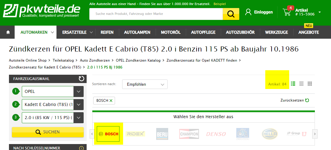 Wenn ich auf PKWteile.de nach Zündkerzen für mein GSI Cabrio (C20NE) suche und die Suche auf Bosch-Teile beschränke, bekomme ich 84 verschiedene Ergebnisse. Welche sollte ich nehmen? Gibt es Gut-Besser-AmBesten? Der Motor ist weitgehend original, möglicherweise eine leicht getunte Nockenwelle da er etwas unruhig läuft, aber Details sind unbekannt.