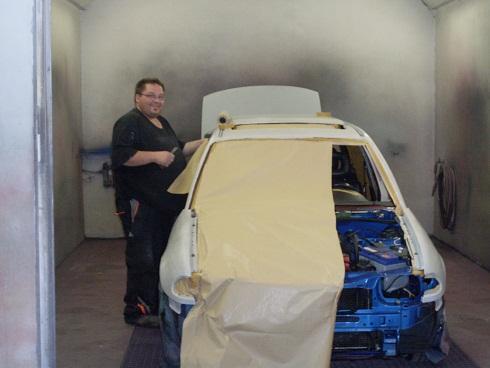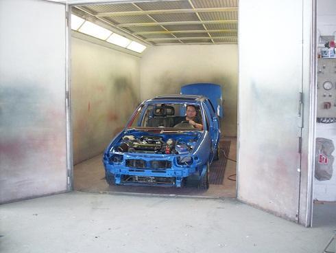 Das ganze war so das mein Kollege am 26.6. um 22.00 anrief und sagte ich hab am 30.6. zeit fürs lackieren. Zeitlich natürlich knapp weil ich alles vorarbeite und füller. Wie es so ist erstmal die Felgen aubauen,vorher war ne 9x16 drau da sollte ne 8x17 locker passen. Hinten gar kein ding aber vorne...oh je...