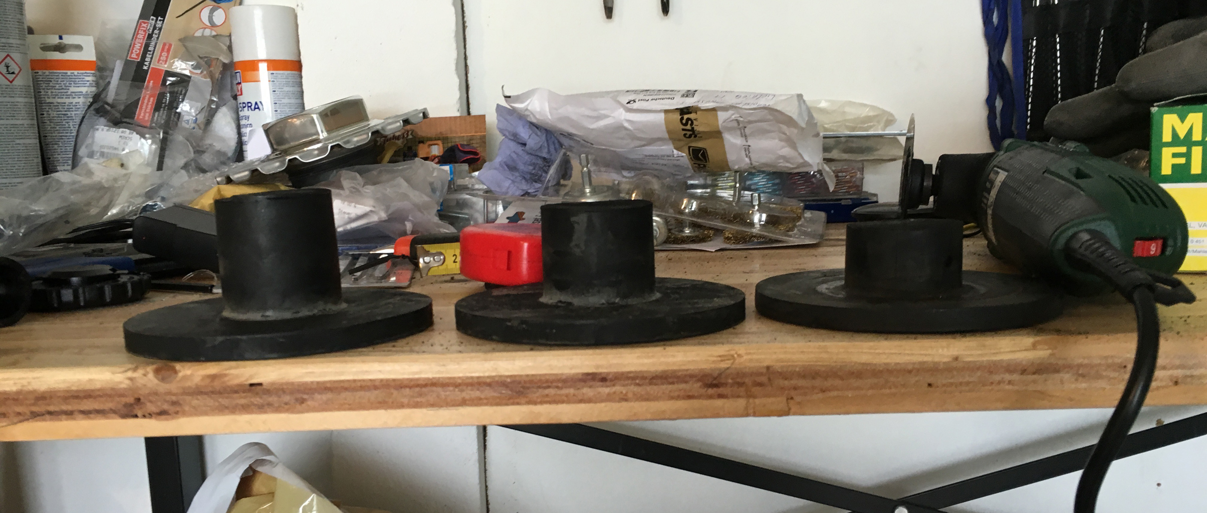 Auf dem Bild ist rechts die bisherige Größe zu sehen, links der erste Versuch und in der Mitte die aktuelle Höhe des Federwegbegrenzers.