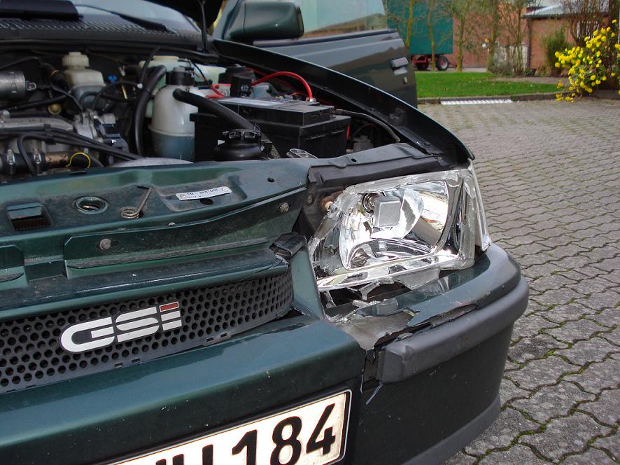 Da ich endlich mit unserem GSI Cabrio fertig war und der Wagen super läuft, ist mir am Mittwoch abend auf der Tankstelle jemand rückwärtz reingefahren. Mein Opelhändler schätze grob übern Daumen 3000 bis 4000 Euro. Kaputt sind linker Scheinwerfer, Blinker, Stoßstange, Motorhaube und der Querträger. Da der wagen erst komplett geschweißt und lackiert wurde, wollt ich ihn nicht wegwerfen, zumal er erst 74000 gelaufen hat.